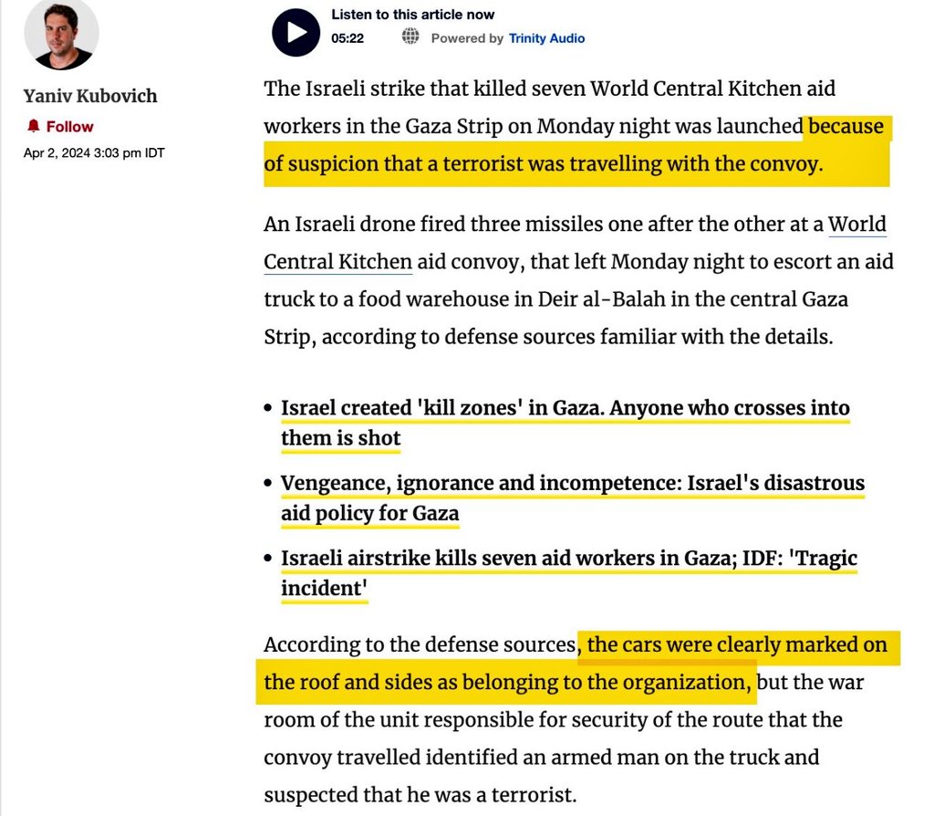 If the World Central Kitchen workers had been killed by Hamas rockets or gunfire, the spin on the story, its coverage and comments from the loyal Zionist politicians and gaslit readers would be different.